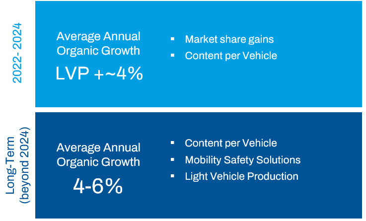 Vi uppdaterar våra tillväxtmål. För de närmaste tre åren, dvs. 2022–2024, förväntar vi oss att växa organiskt* med omkring 4 procentenheter mer än den genomsnittliga tillväxten för fordonsproduktionen per år.
