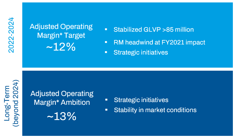 För 2022 till 2024 siktar vi på en justerad rörelsemarginal* om 12 procent. Det bygger på ett antagande om en stabiliserad global fordonsproduktion om minst 85 miljoner och att råvarusituationen inte får en större negativ påverkan på rörelsemarginalen än den väntas få för helåret 2021. När våra pågående och planerade strategiska initiativ är fullt genomförda och marknadsvillkoren har stabiliserats är ambitionen att ytterligare öka vår intjäningsförmåga till en justerad rörelsemarginal* om cirka 13 procent.